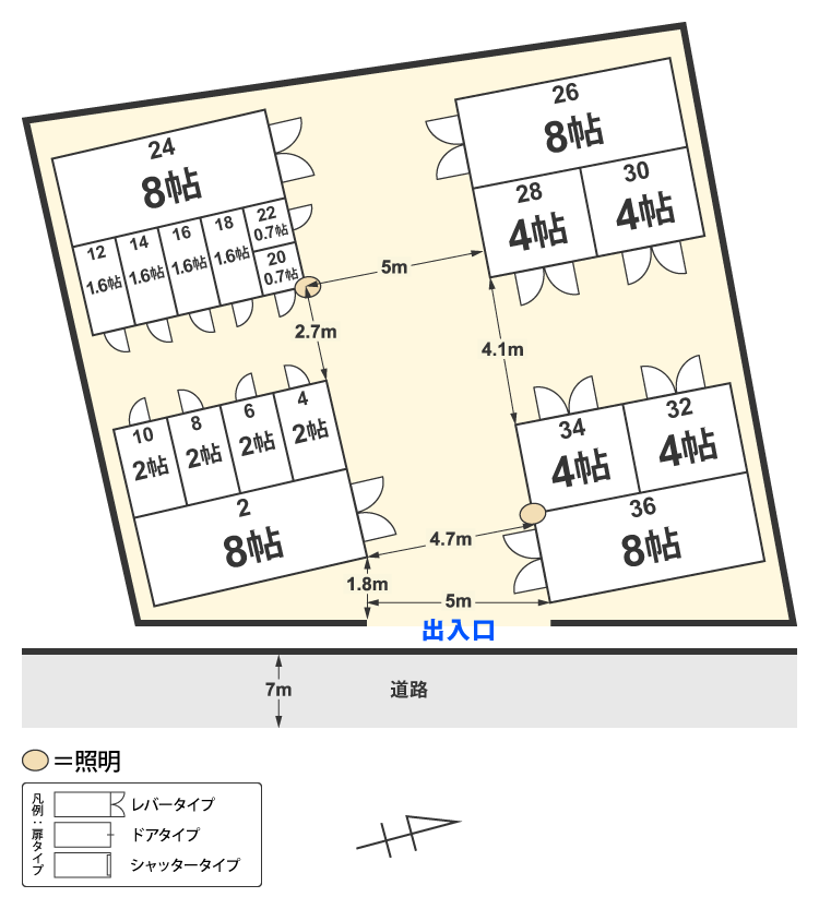 | 種別 | 広さ | 階 | 月額使用料(税込) | 幅×奥行×高さ | お見積り | 申込み |